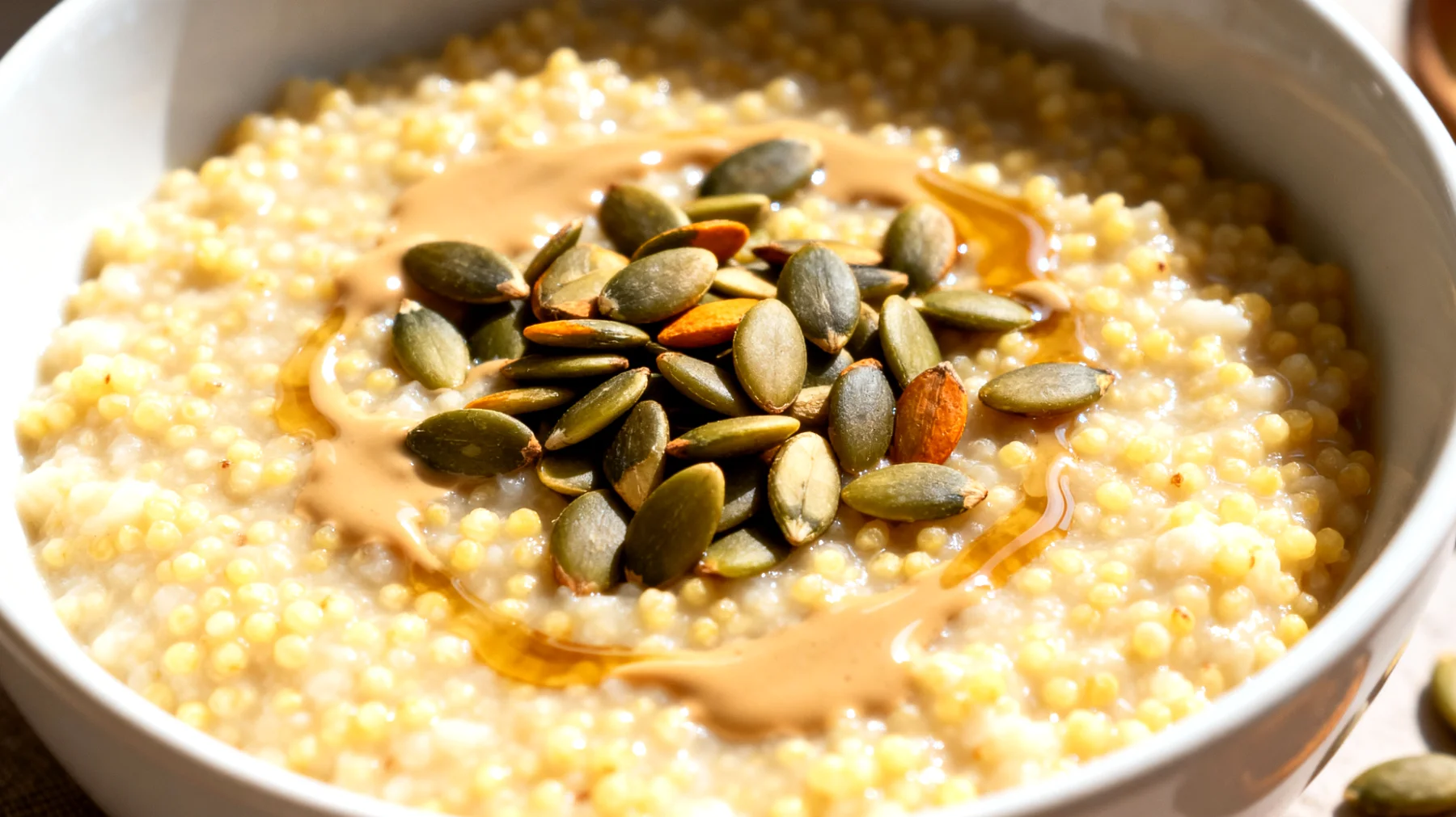 La tahina, crema vellutata ricavata dai semi di sesamo, completa questo trittico nutrizionale apportando calcio biodisponibile, proteine vegetali di qualità e vitamina E dall’azione antiossidante. La sua consistenza cremosa e il sapore leggermente tostato arricchiscono la preparazione trasformandola da semplice porridge a piatto gourmet. L’associazione di miglio, semi di zucca e tahina offre un profilo aminoacidico complementare: mentre il miglio fornisce aminoacidi essenziali in buone quantità, la tahina e i semi di zucca compensano le carenze tipiche dei cereali, creando un piatto che rappresenta un’ottima fonte proteica vegetale anche per chi segue regimi alimentari plant-based.
